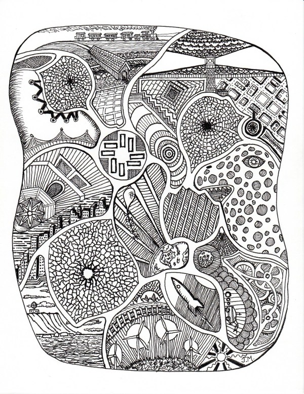 When I don’t have it in me to write – I draw. It keeps the old brain focused. I call this a Super Doodle. Incorporating all the different elements into the drawing was fun, although taxing. My Sakura Micron pens allowed me to blend at least 26 unique components into the piece, with some areas that are three dimensional. To tell the truth, I’m pleased with the end result.